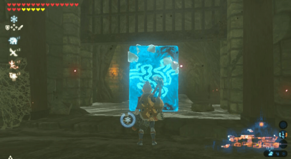 因为铁门下面有水,我们可以用冰柱把门抬起来。