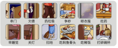 互相拜访,欠债,扔垃圾,饭桌上吵架,在外面晾衣服,吃药,