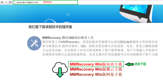 在浏览器的地址栏进入mm recovery products(www.db-helper.com)的官网,打开官网,在网页中找到下载地址,点击下载。这个工具可以通过便携应用下载后直接使用。