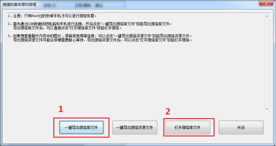 在“微信恢复向导”对话框中,先通过USB数据线连接电脑和手机,然后点击如下图的“一键导出微信库文件”按钮,即可导出微信库文件。然后点击“打开微信库文件”按钮,就可以打开需要恢复微信聊天记录的浏览页面。