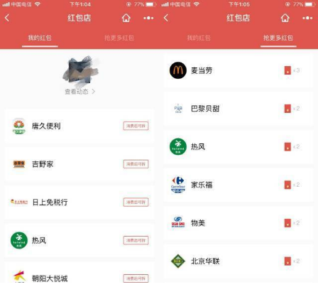 点开“红包店”小程序,每个人都会看到不一样的页面。只能看到朋友买过的线下店。相应的,你只能抢这些朋友买过的线下店铺的红包。
