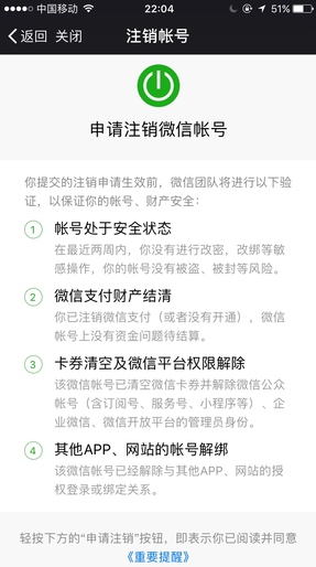 随着新版本的到来,“注销账号”选项在微信安全中心悄然上线。据介绍,只要用户符合要求,就可以申请永久销号。