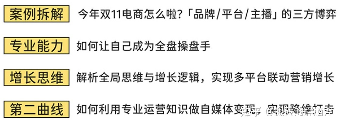 可见,编号的每一个点其实都有相应的操作技巧,没有基础还是很难做到的。建议运营小白可以去看看知乎的全媒体训练营:是由几大互联网公司的VP+核心项目负责人+资深内容制作人联合开发的训练营,针对主流平台的营销规则(包括流量机制+运营模式、用户画像、货链),帮助你构建完整的全媒体知识体系。如有必要,单击: