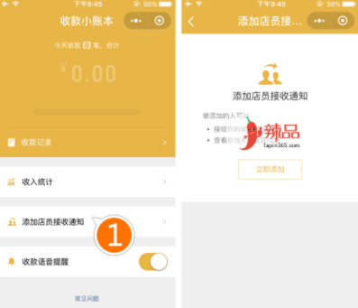 1.打开微信App——“小收款台账”小程序——添加收款员接收通知。