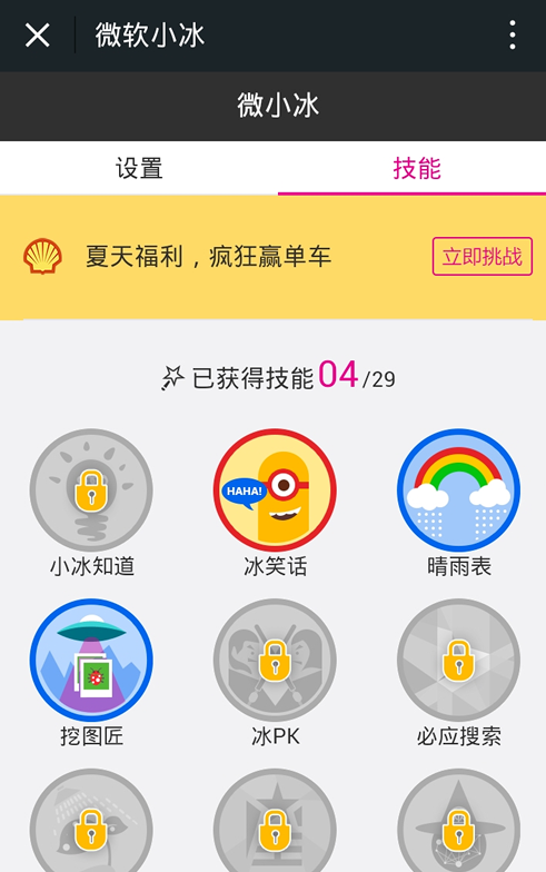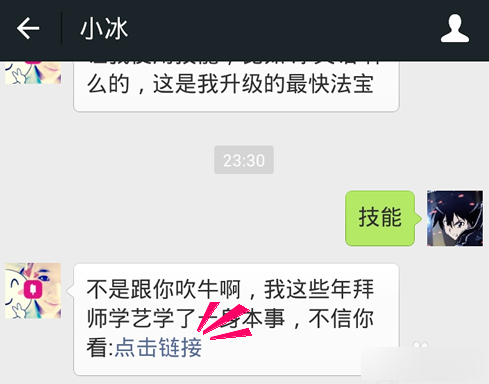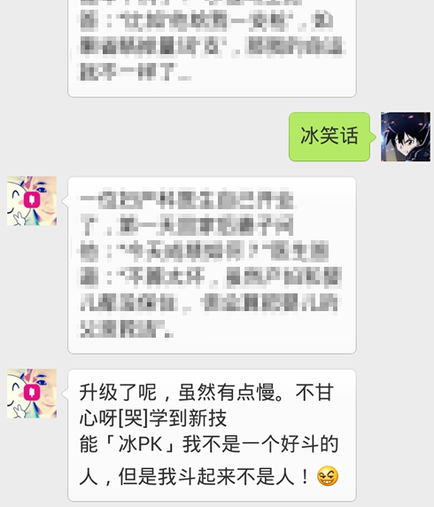 5.另一种方式是在聊天窗口输入技能名称,比如输入【冰笑话】回复一个冷笑话。其他技能的用法也差不多。当技能使用到一定程度,可以升级解锁新技能。