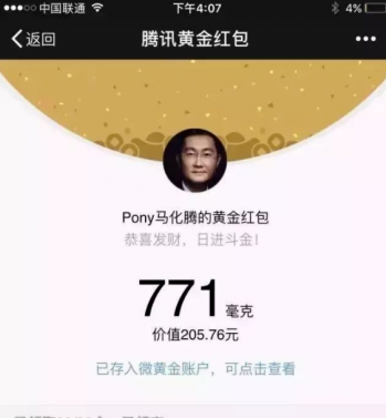2.当时黄金红包是腾讯财付通和中国工商银行联合推出的。与装满现金的红包不同,黄金红包是以毫克计算的。因为黄金价格是根据市场波动的,你持有的黄金价值也是波动的,你抢到的红包可能一夜醒来就增值了。