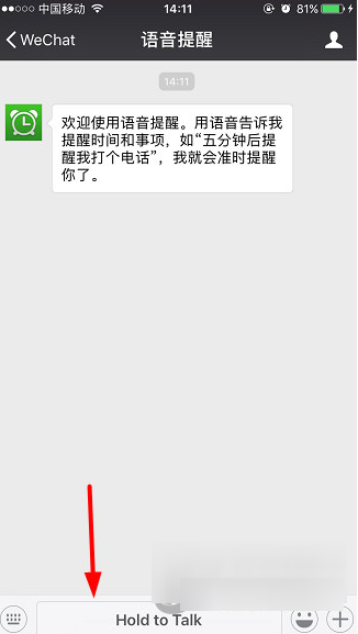 8.此时打开聊天界面,按住语音键,说出提醒,比如红包提醒。