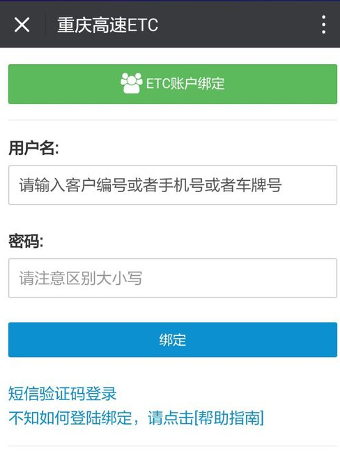 5.在绑定页面输入用户名和密码相关信息,点击下方的【绑定】,完成ETC账户的绑定。