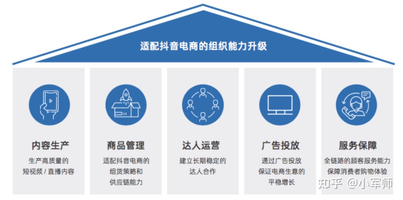 在Tik Tok的电商营销模式下,随着商家在Tik Tok参与度的提高,商家可以从内容、商品、人才、广告、服务五个精细化方面进行组织架构升级。