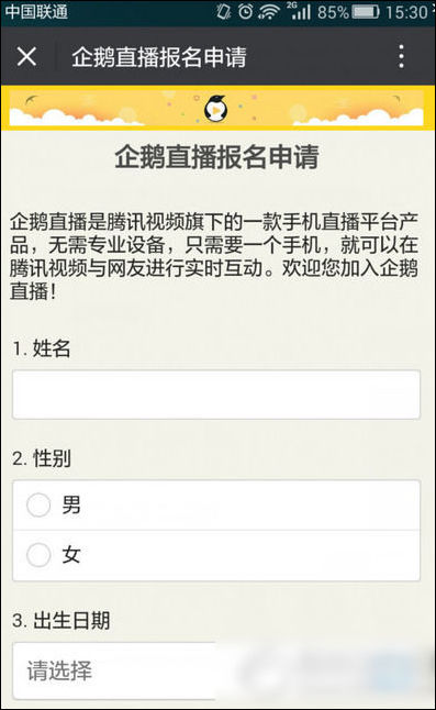 1、电脑上打开企鹅直播,点击加入我们;手机端可以点击进入这个填写注册申请:点我