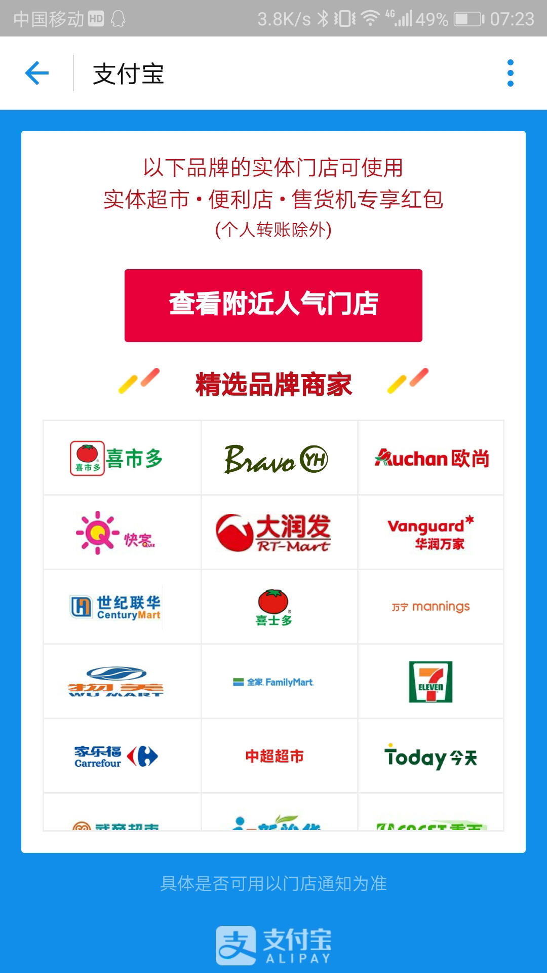 不过参与专属红包活动的实体店不少,包括线下各超市、便利店、自动售货机等。
