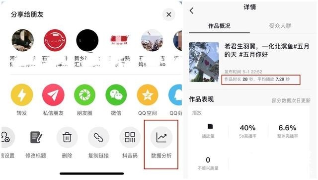 视频的平均播放时间。关注视频的平均播放时间,了解视频内容的质量。查看路径:打开Tik Tok,选择一个自己的作品,点击底部的“数据分析”,跳转到单个视频的数据表示。