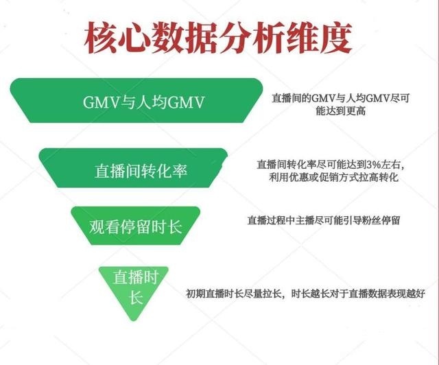 我们在直播的过程中肯定会遇到一些问题。应该根据哪些数据指标来优化数据?我们来看看直播核心数据分析的维度模型。从下到上依次是直播时长、观看时长、直播转化率、人均GMV和GMV。