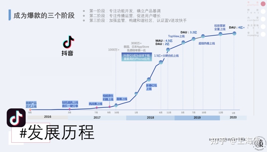 当时的市场老大是Aauto快一点,三年积累了3亿用户。此外,还有一些短而频繁的app非常受欢迎,比如小卡修。2022年,Tik Tok入局,切入音乐短视频这一细分领域。据说在当时的Tik Tok,邀请一二线城市的音乐学院舞蹈学院的学生来拍视频,妹妹和哥哥都是洋气的,很漂亮。音乐视频质量极高,剪辑技巧特别牛逼。这期间,Tik Tok还在潜伏打磨产品,开发各种特效贴纸。当时Tik Tok还不叫A.me- music视频社区,2022年12月更名。然后我马上更新了世界流行的颜色标签,高调推荐。还迅速引入了通讯录、QQ好友,做了社交尝试。