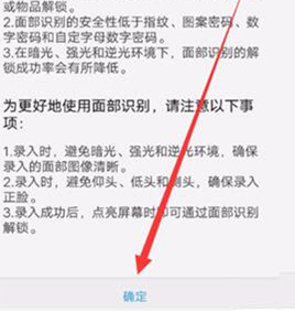 第三步:输入密码后,会弹出免责声明,我们点击【确定】按钮,然后将脸部对准手机上的圆圈,按照提示输入脸部,等待输入完成。