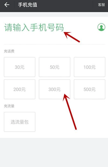 5.输入手机号码,选择充值金额。