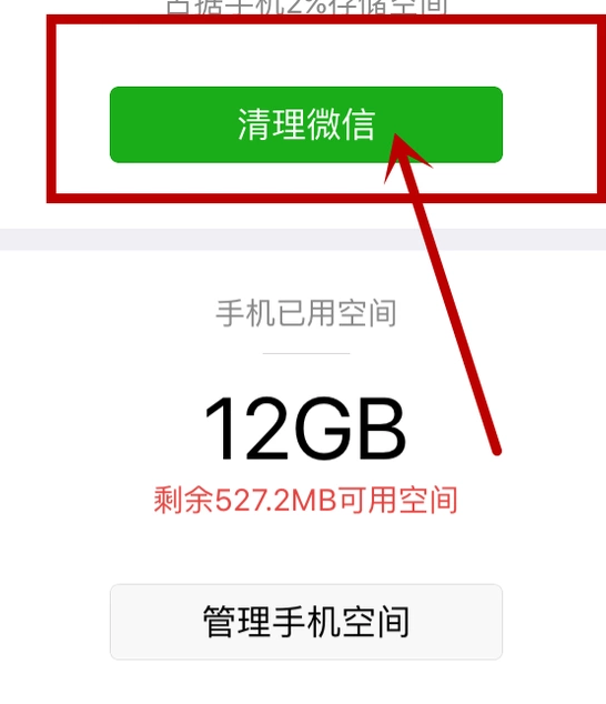 2.在存储空间的界面,我们可以看到系统中有多少空间可用,微信占用了多少空间。还有一个清理微信缓冲垃圾的功能。现在,让我们单击“清理”。有时候,清理完缓冲区垃圾后,你会发现以前无法查看的文件也可以查看了。