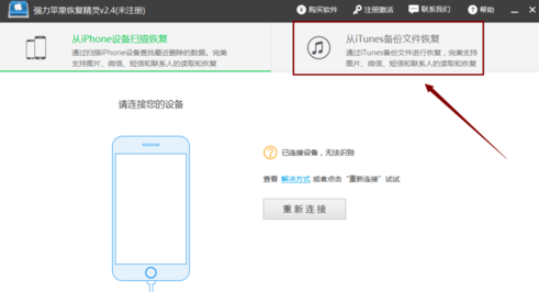 3.打开已安装的软件,选择“从iTunes备份文件恢复”。