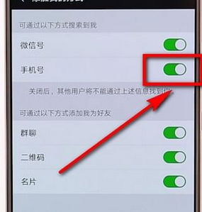 2、然后关闭【您可以通过以下方式搜索我】栏中的【手机号码】开关
