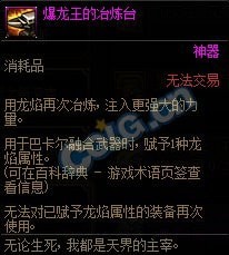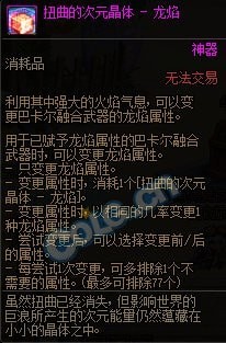 通关奖励中必须获得的龙焰水晶,可以兑换爆破龙王冶炼平台赠送给武器膜的第三个入口,也可以用来随机改变第三个入口的属性。