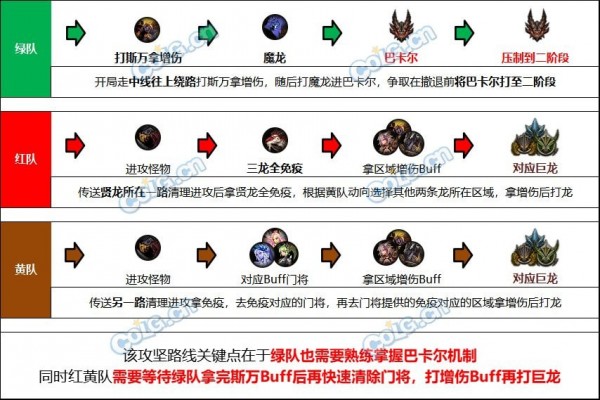 红黄队攻龙的时候也要先拿地域伤害Buff。因为恶龙区域的缓冲给了绿队,所以可以认为恶龙是放在最后攻击的。