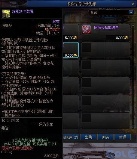 你可以在入口NPC购买8000金币,道具是消耗品。使用后按TAB键释放跳跃装置。