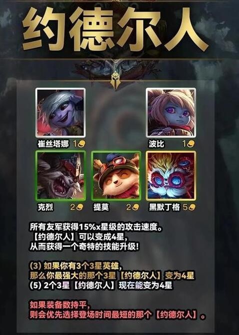 羁绊效果:所有友军获得15%x星攻击速度。【约德尔人】可以成为4星,从而获得奇特的技能升级!