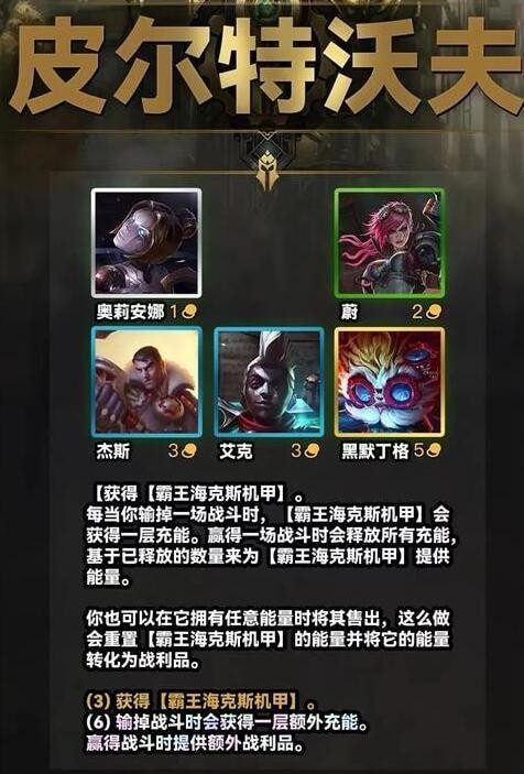 羁绊效果:每输掉一场战斗,【霸王黑克斯机甲】就会获得一层冲锋。赢得一场战斗将释放所有电荷,并根据释放的数量为霸王黑克斯机甲提供能量。