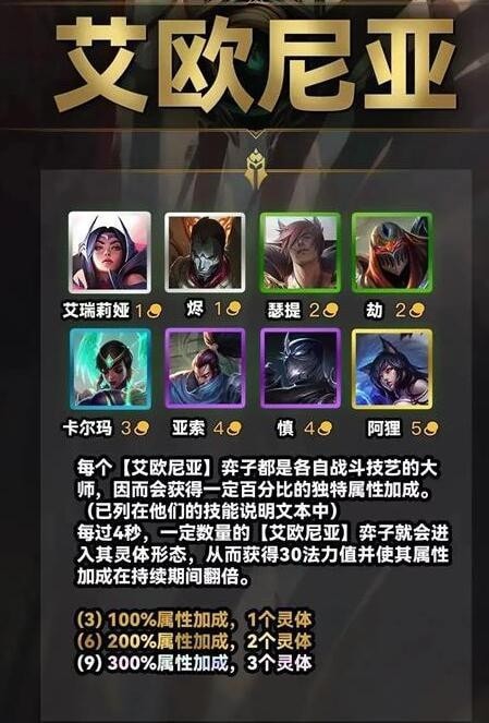 羁绊效应:每个爱奥尼亚棋手都是自己战斗技能的集大成者,因此会获得一定比例的独特属性加成。(列在他们的技能描述文字中),每4秒,一定数量的【爱奥尼亚】玩家会进入他们的精神形态,从而获得30法力值,持续时间属性加成翻倍。