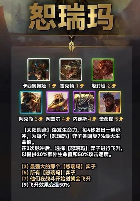 羁绊效果: 【太阳圆盘】生命力旺盛,每4秒发出一次脉冲,为每个玩家恢复7%最大生命值。2脉冲后选择舒瑞玛翱翔提供20%额外生命值和50%攻击速度。
