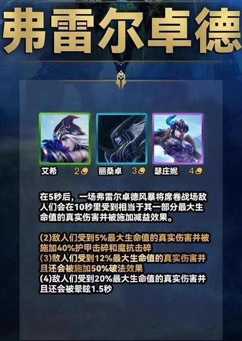 羁绊效果:5秒后,一场Freudemire风暴将席卷战场,敌人将在10秒内受到相当于自身部分最大生命值的真实伤害,并被给予减免效果。