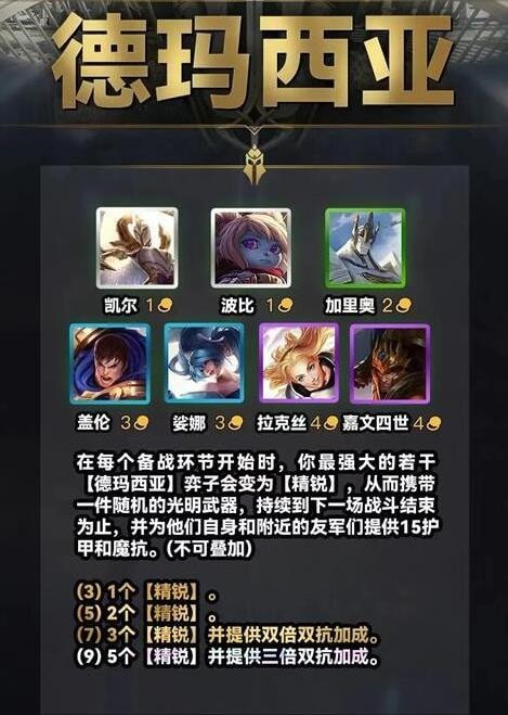 羁绊效果:在每次准备环节开始时,你的一些最强大的[德玛西亚]玩家会成为[精英],从而携带一件随机的轻武器并持续到下一场战斗结束,为自己和附近的友军提供15的护甲和魔抗。(非叠加)