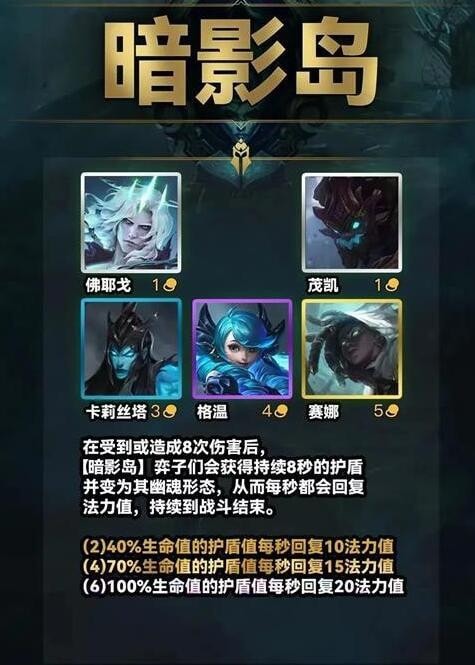 羁绊效果:暗影岛的玩家在承受或造成8点伤害后,会获得一个持续8秒的护盾,并变成幽灵形态,从而每秒恢复法力值,直至战斗结束。