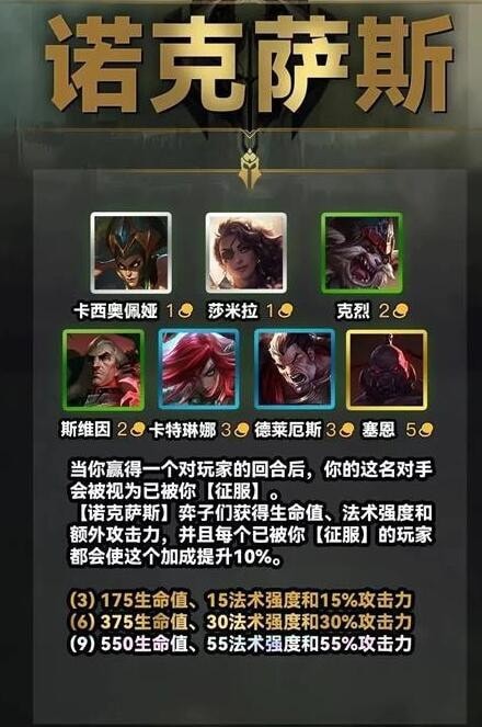 羁绊效果:当你对该玩家赢了一回合,你的对手将被视为被你征服。【Noxas】玩家获得生命值、法术强度和额外攻击力,每被你征服一个玩家,这个加成增加10%。