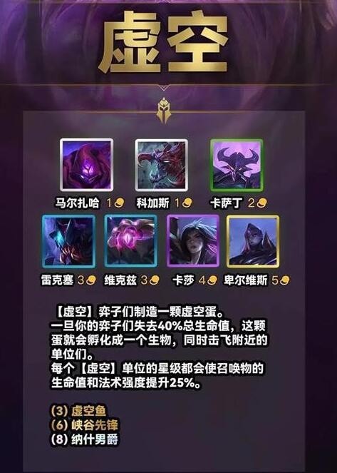 束缚效果:[虚空]玩家创造一个虚空蛋。一旦你的玩家失去40%的总生命值,这个蛋就会孵化成一个生物,同时打击附近的单位。每一个虚空单位的星级,都会增加被召唤物25%的生命值和法术强度。