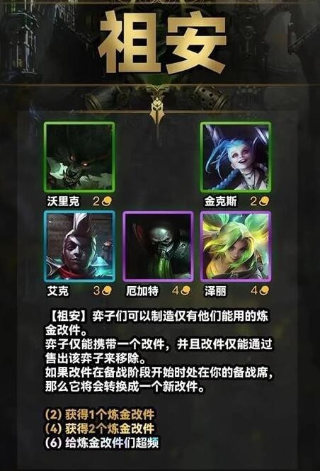 羁绊效果:[安祖]棋手可以进行只有他们能使用的炼金术修改。一个棋子只能携带一个修改,修改只能通过出售棋子来移除。如果在准备阶段开始的时候,修改已经在你的准备座位上了,它将被转换成一个新的修改。
