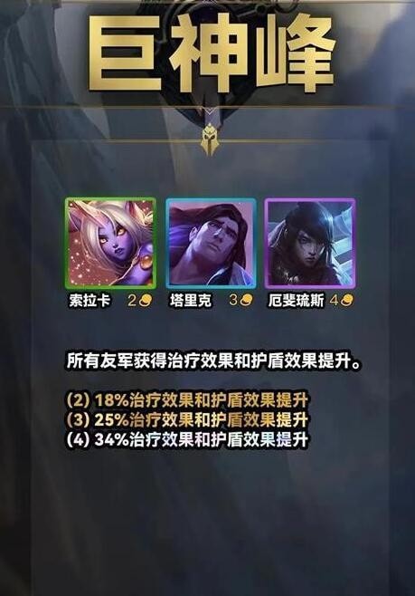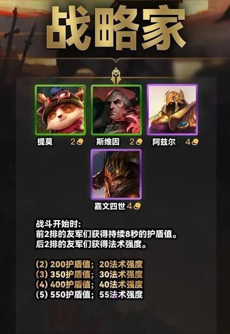 羁绊效应;战斗开始时:前两排友军获得持续8秒的护盾值。第二排的盟友获得法术强度。