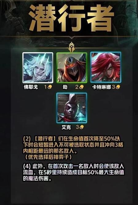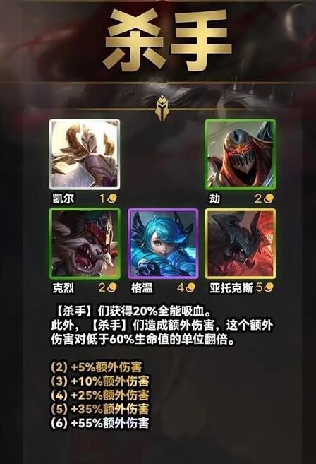 羁绊效果:[杀手]获得20%全方位吸血。此外,[杀手]造成额外的伤害,对生命值低于60%的单位加倍。