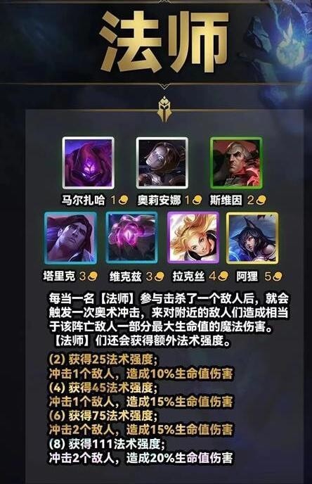 羁绊效果:每一次【法师】参与杀死一个敌人,都会触发一次奥术冲击,对附近的敌人造成相当于被杀死敌人最大生命值一部分的魔法伤害。[法师]他们也将获得额外的法术强度。