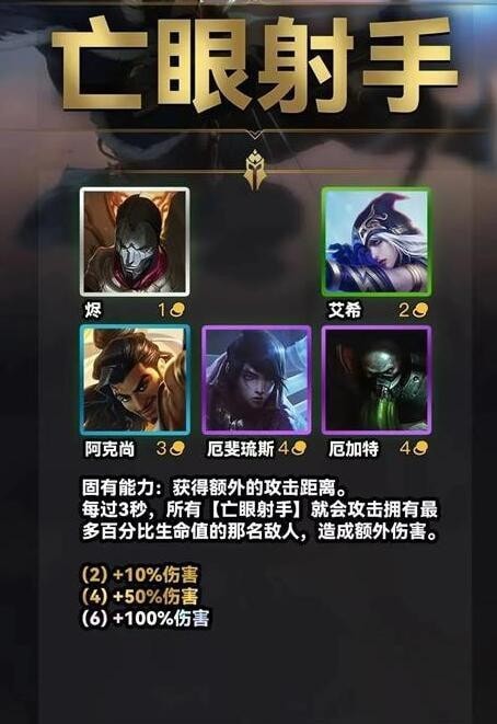 羁绊效果:先天能力:获得额外的攻击距离。每3秒,所有【盲射手】都会攻击生命值百分比最多的敌人,造成额外伤害。