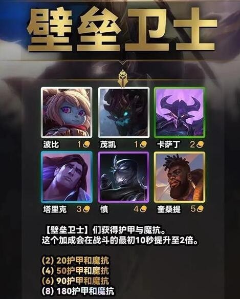 羁绊效果:[路障守卫]获得护甲和魔法抗性。这个加成会在战斗的前10秒翻倍。