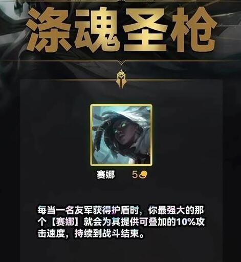 羁绊效果:友军每得到一个盾牌,你最强大的【塞纳】会为其提供叠加10%的攻击速度,直到战斗结束。
