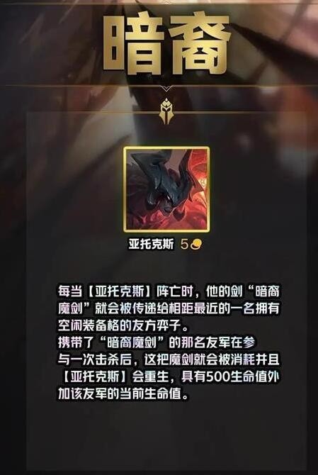 羁绊效果:每当[阿托克斯]被杀死时,他的剑& ldquo黑暗魔剑& rdquo它将被传递给最近的有空装备格子的友方棋手。用& ldquo黑暗魔剑& rdquo友军参与一次击杀后,这把魔剑会被消耗掉【Artox】重生,500点生命值加上友军当前的生命值。