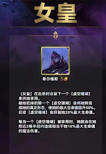 羁绊效果:她吃下的第一颗【虚空珊瑚】会将她转化为真实形态,并增加她最大生命值50%。后续【虚空珊瑚】会恢复她20%最大生命值。