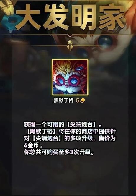 羁绊效果:获得一个可用的【尖端电池】。[黑默丁格]将为您商店中的[冰山堡垒]提供6个金币的升级。您总共最多可以购买3次升级。