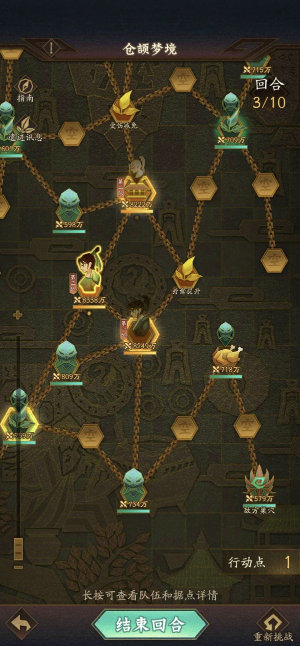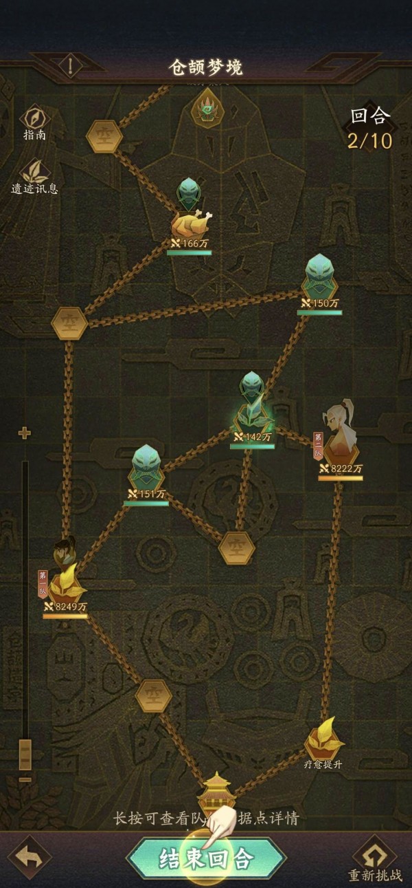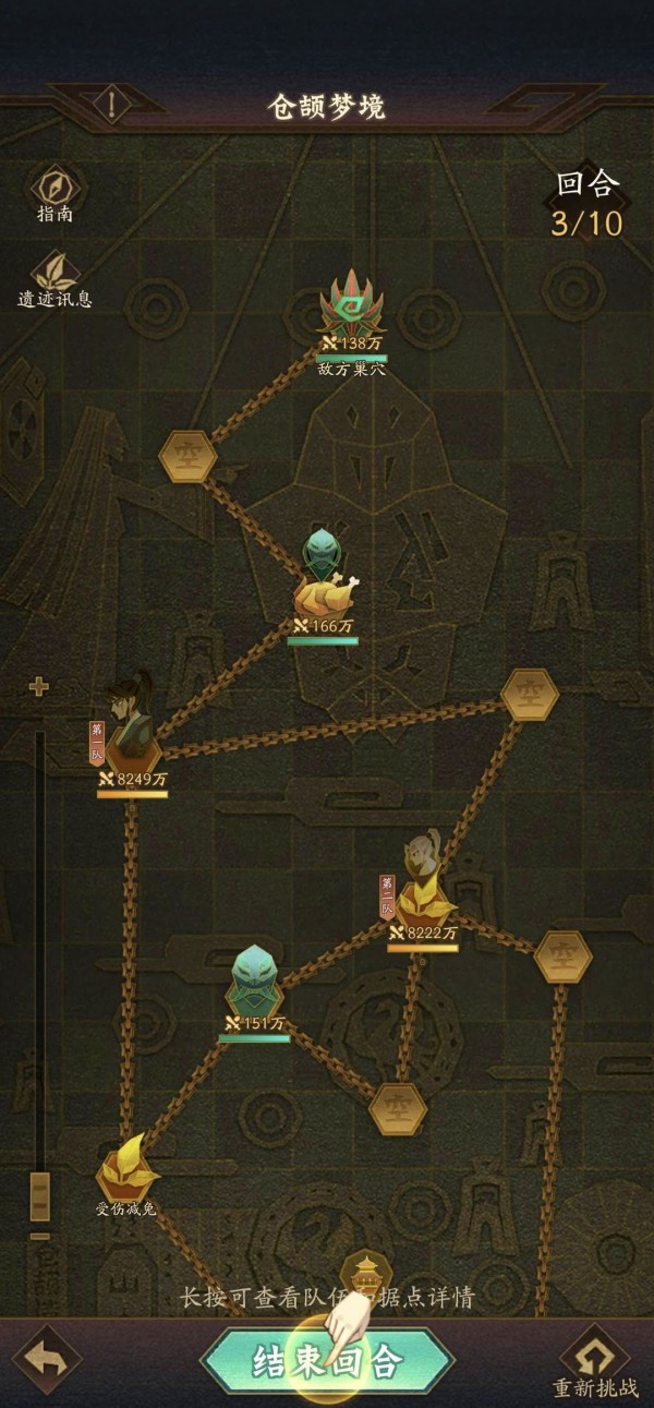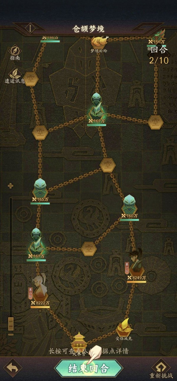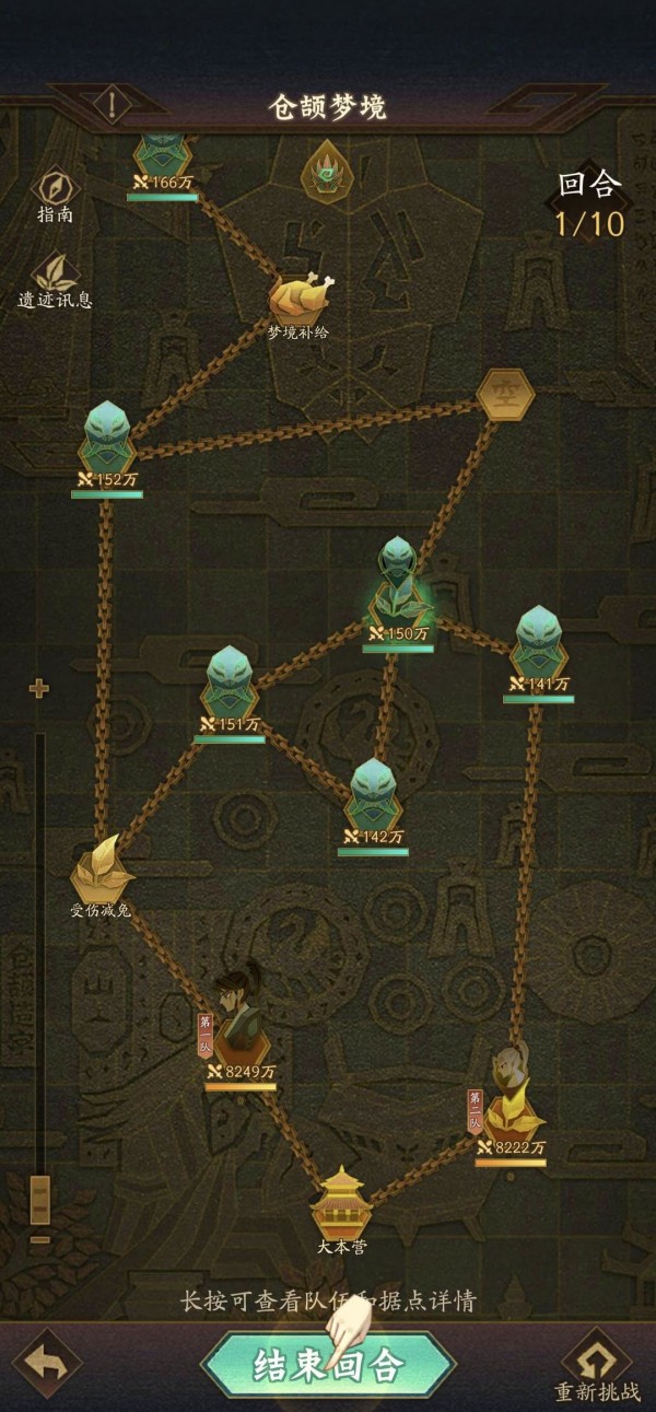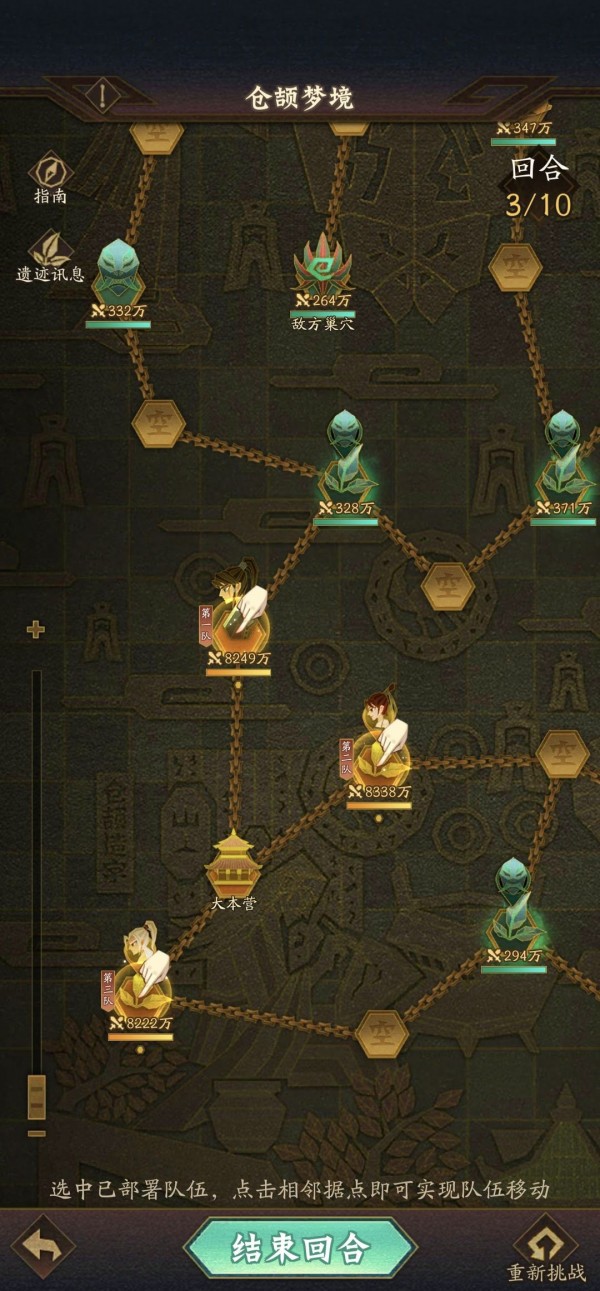 第三回合后:第二队优先占领梦想增益遗迹,主队上敌巢,也会触发补给效果& mdash& mdash丰富的食物为主队恢复所有伙伴20%的生命值。因为场上除了敌人的老巢之外没有敌军,副队可以原地休息,多余的副队动作点可以直接跳过不用。