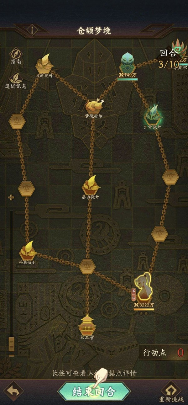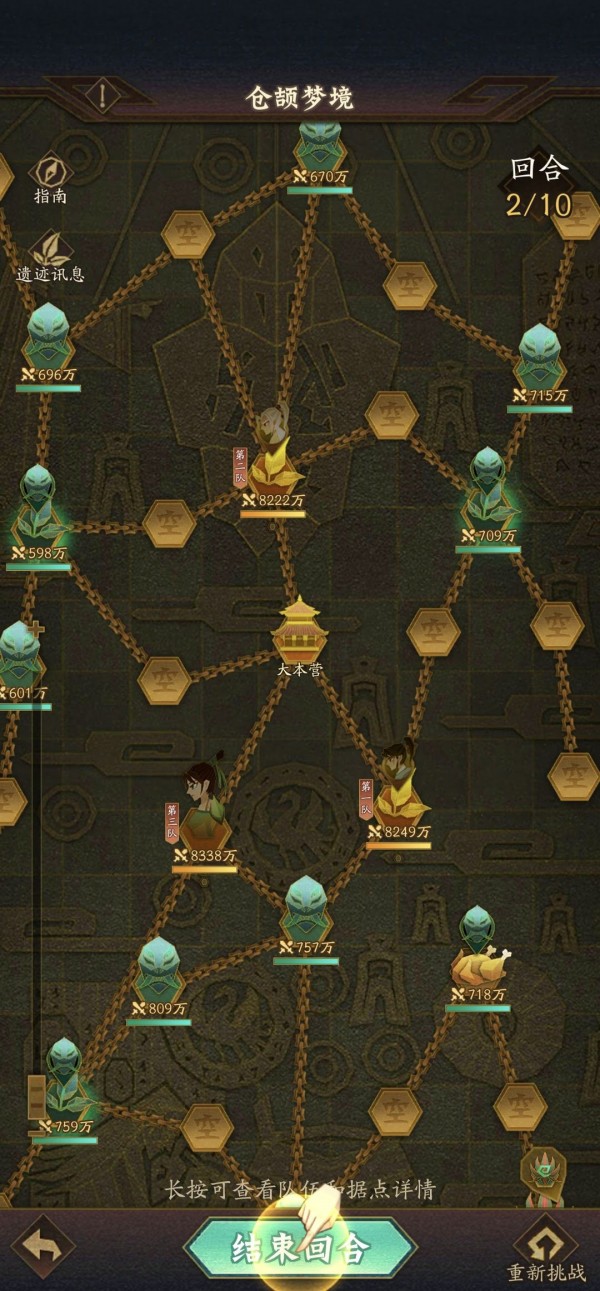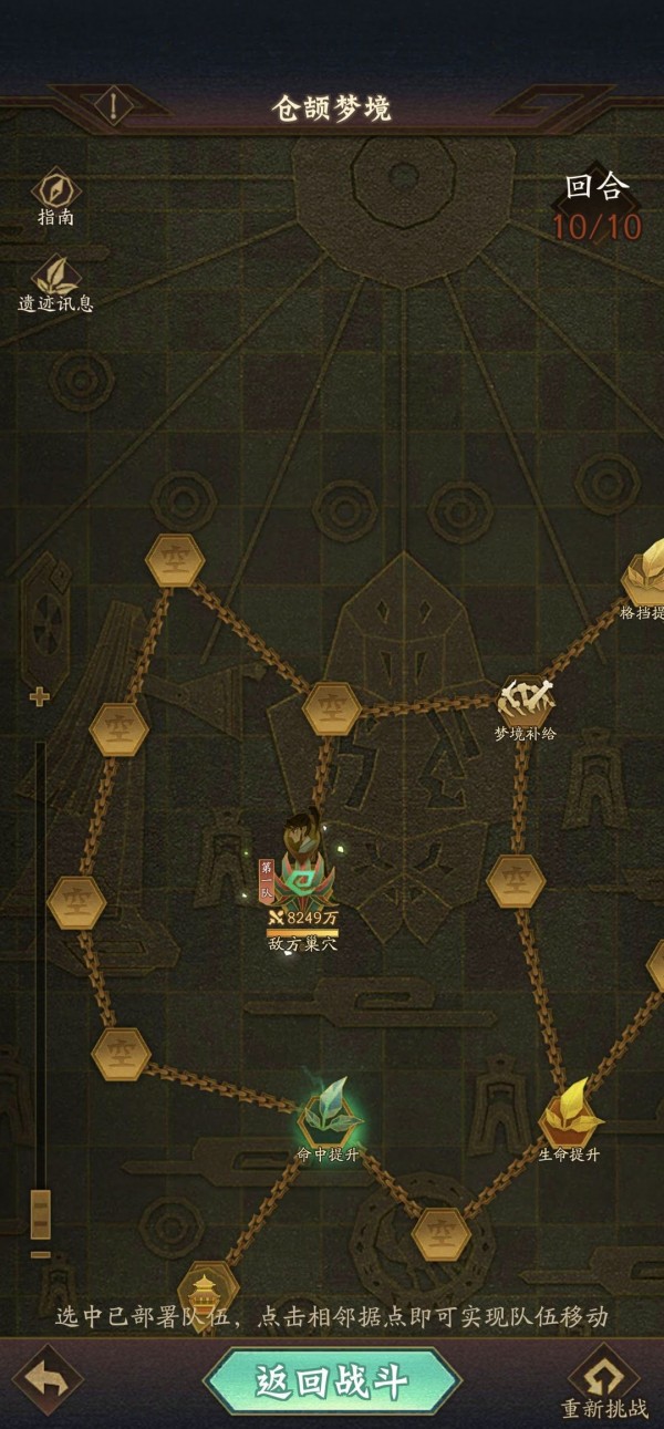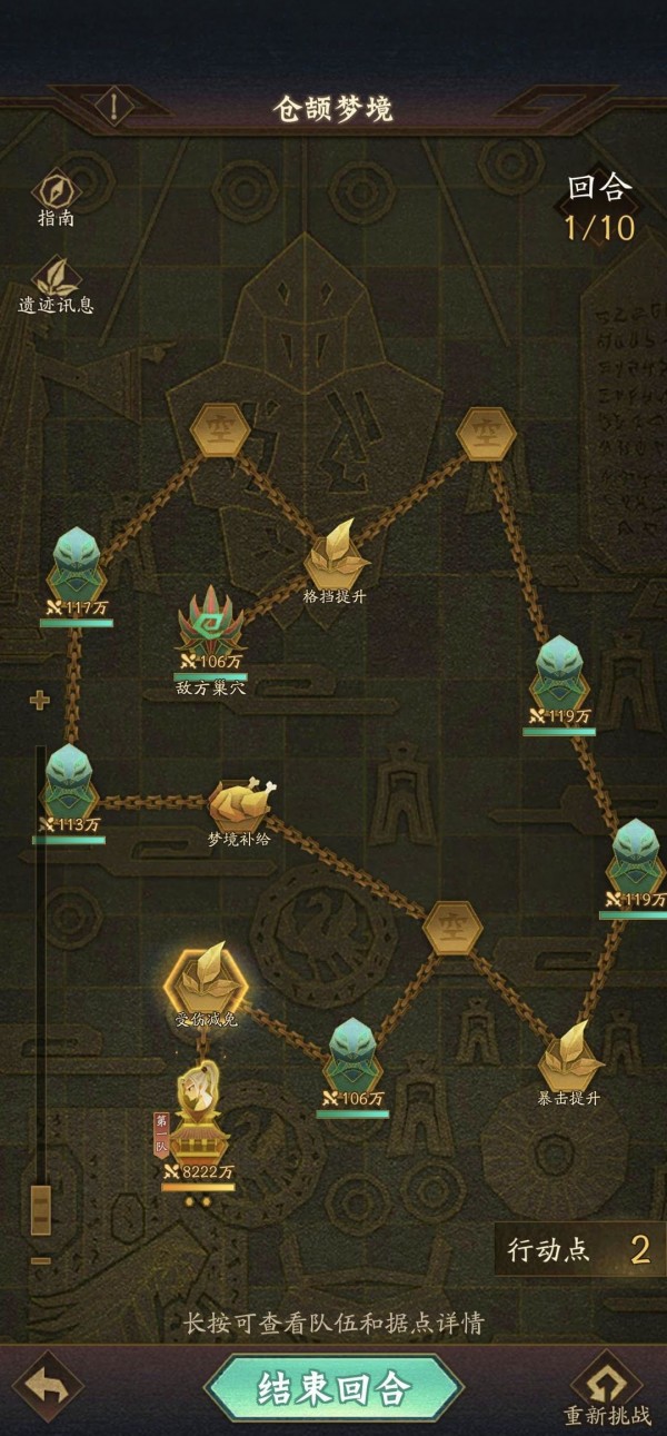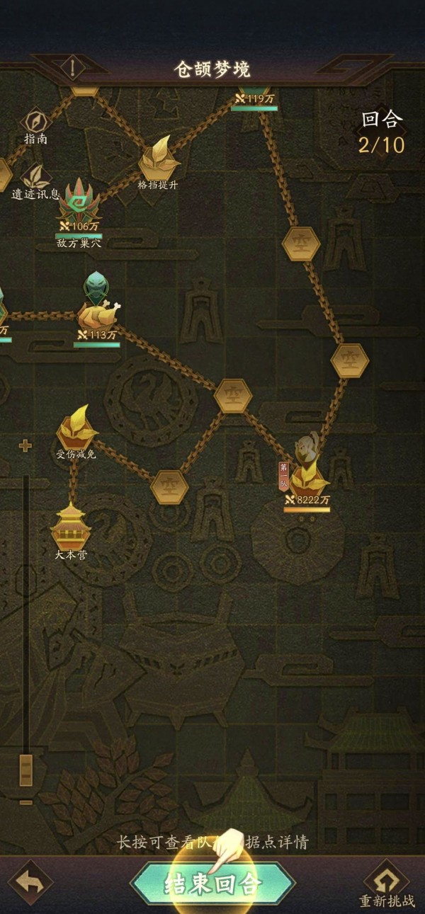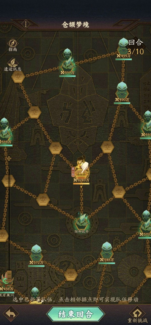 第三回合后:第二队优先占领梦想增益遗迹,主队上敌巢,也会触发补给效果& mdash& mdash丰富的食物为主队恢复所有伙伴20%的生命值。因为场上除了敌人的老巢之外没有敌军,副队可以原地休息,多余的副队动作点可以直接跳过不用。