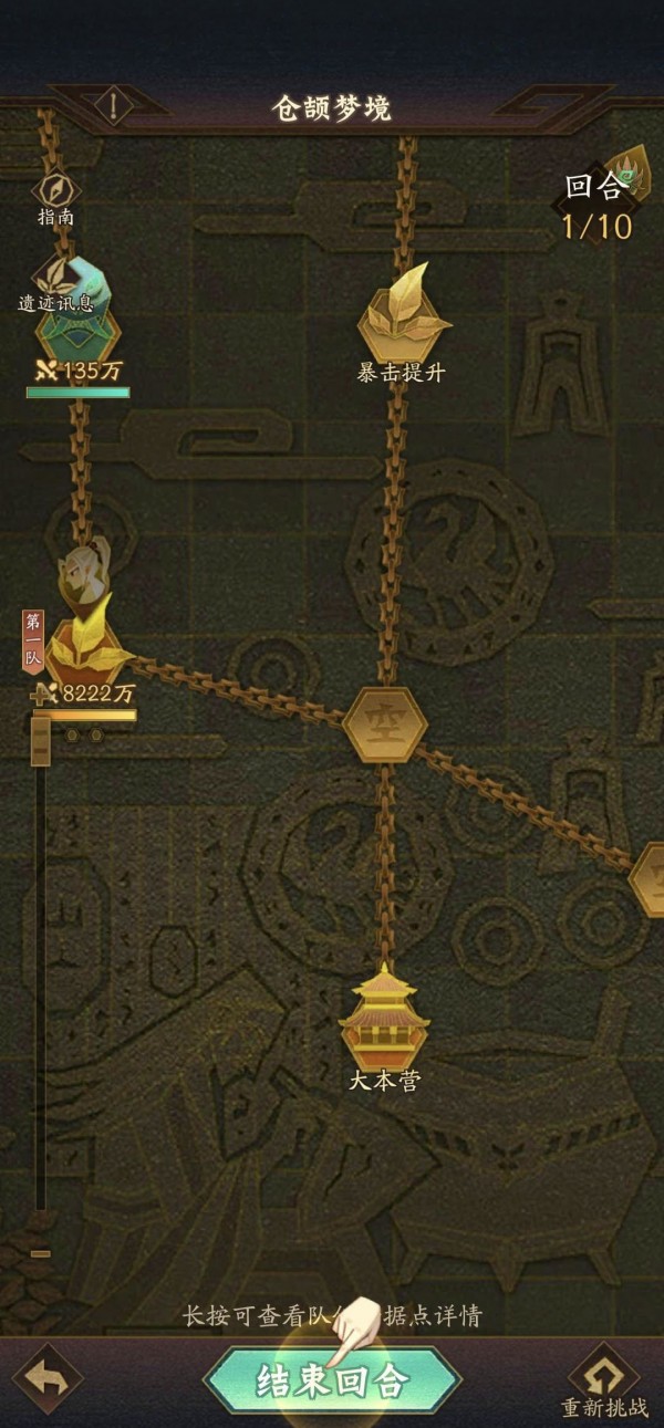 通关的条件是占领敌人的老巢。道友可以靠神勇一路打敌人的队伍到黄龙,也可以靠足智多谋绕过敌人的队伍通关。需要注意的是,行动回合数是有一定限制的,不要把战斗拖延太久。当道友回合数达到上限且未能通关,大本营被敌人占领或部署队伍全军覆没时,将视为副本失败,需要重新开始。