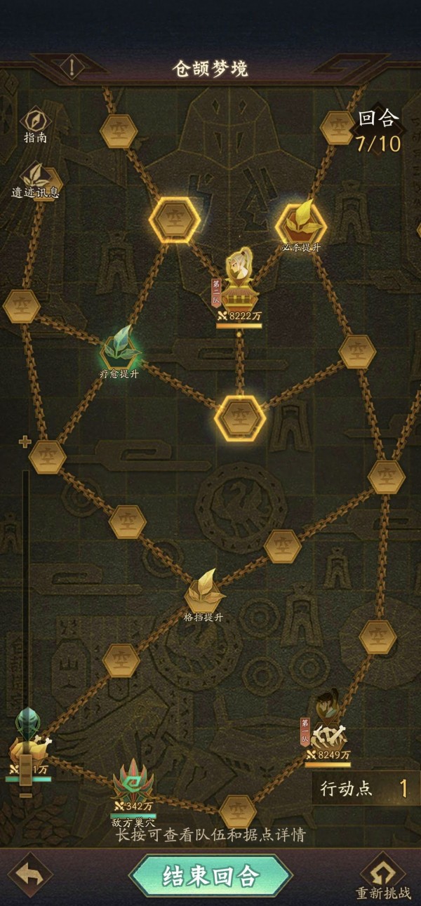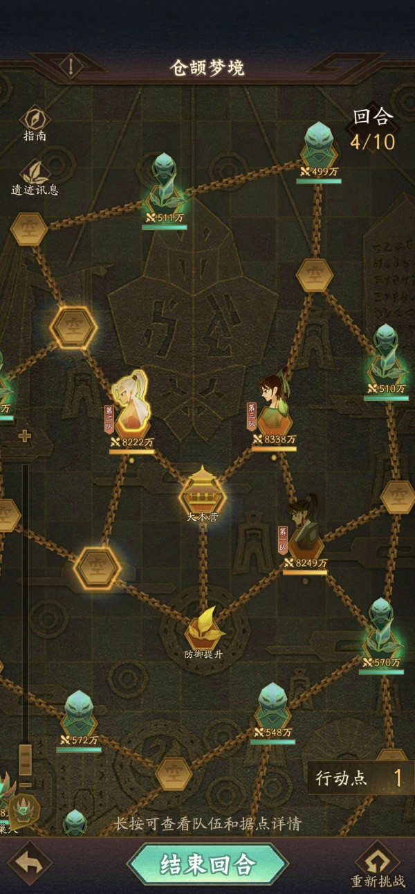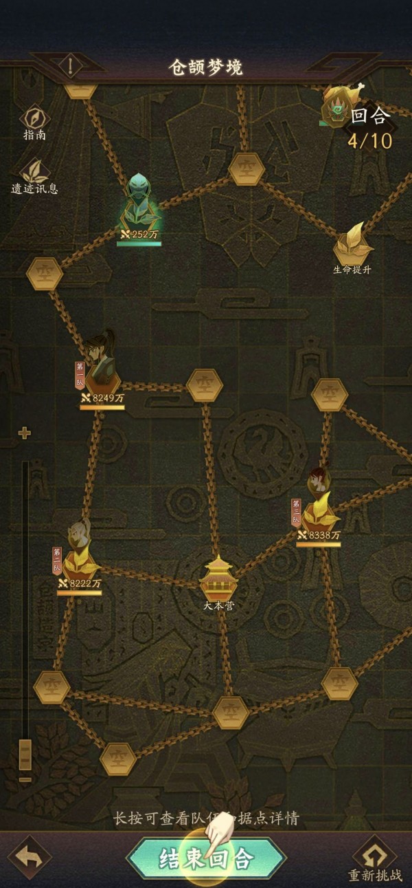 第三回合后:主队向下占领晋级防御的遗迹节点,沿右下方最短路线通过减伤节点前往敌人老巢;如果两队有余力,可以抢格挡提升、闪避提升、治疗提升三个遗迹节点,否则可以守住大本营。