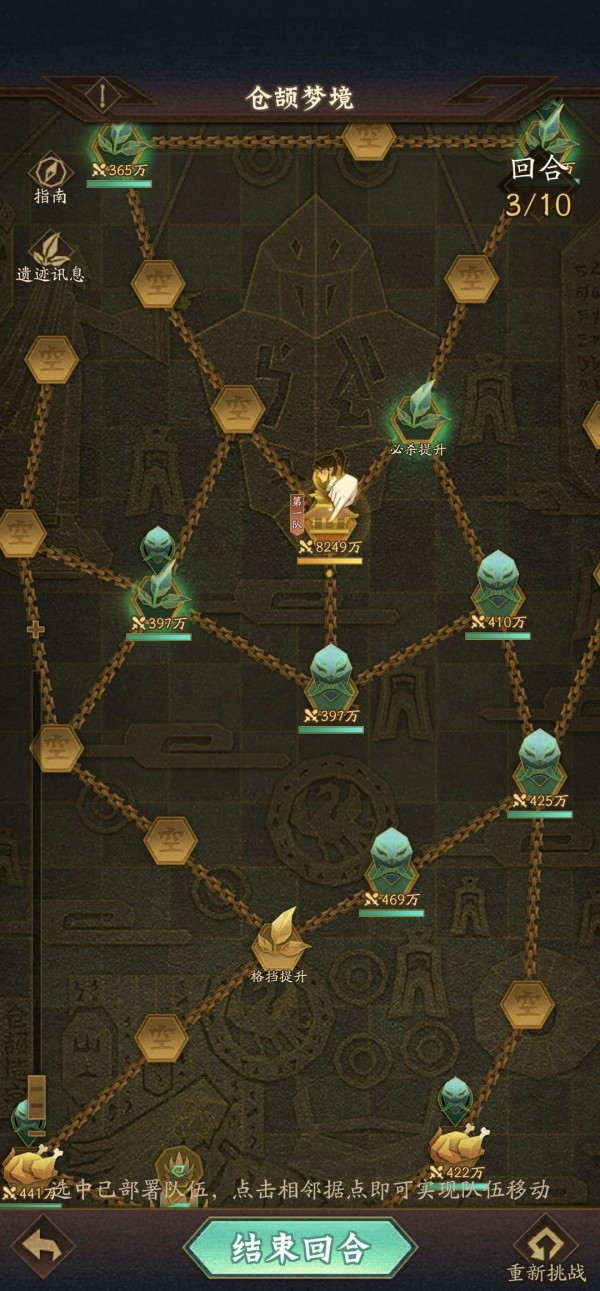 第三回合后:终于攻下右路敌人后,击败北伐中的最后一个障碍,直奔敌巢。如果战力低,可以占领更多增益遗迹获得最大战力,给BOSS最后一击。